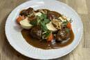 Duszone policzki wieprzowe w piwie, parzona bułeczka, marchewka, sos rozmarynowy